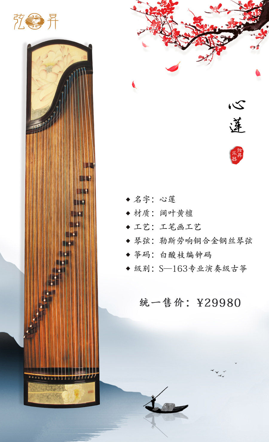 弦昇古筝-心莲是弦昇开发并生产的阔叶黄檀古筝;品名:心莲;面板/底板材质:泡桐;岳山/侧板材质:阔叶黄檀;工艺:工笔画;琴弦:勒斯劳响铜合金钢丝尼龙弦;筝码:白酸枝编钟码;级别:S-163专 业演奏级古筝;