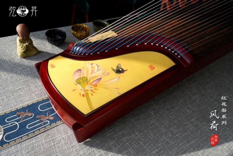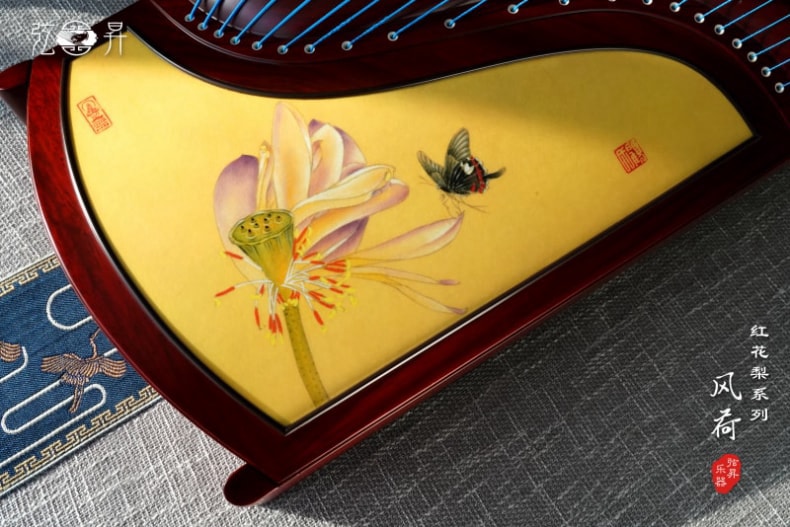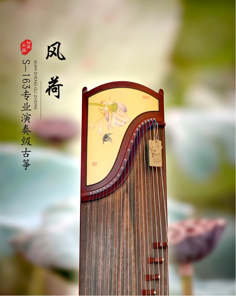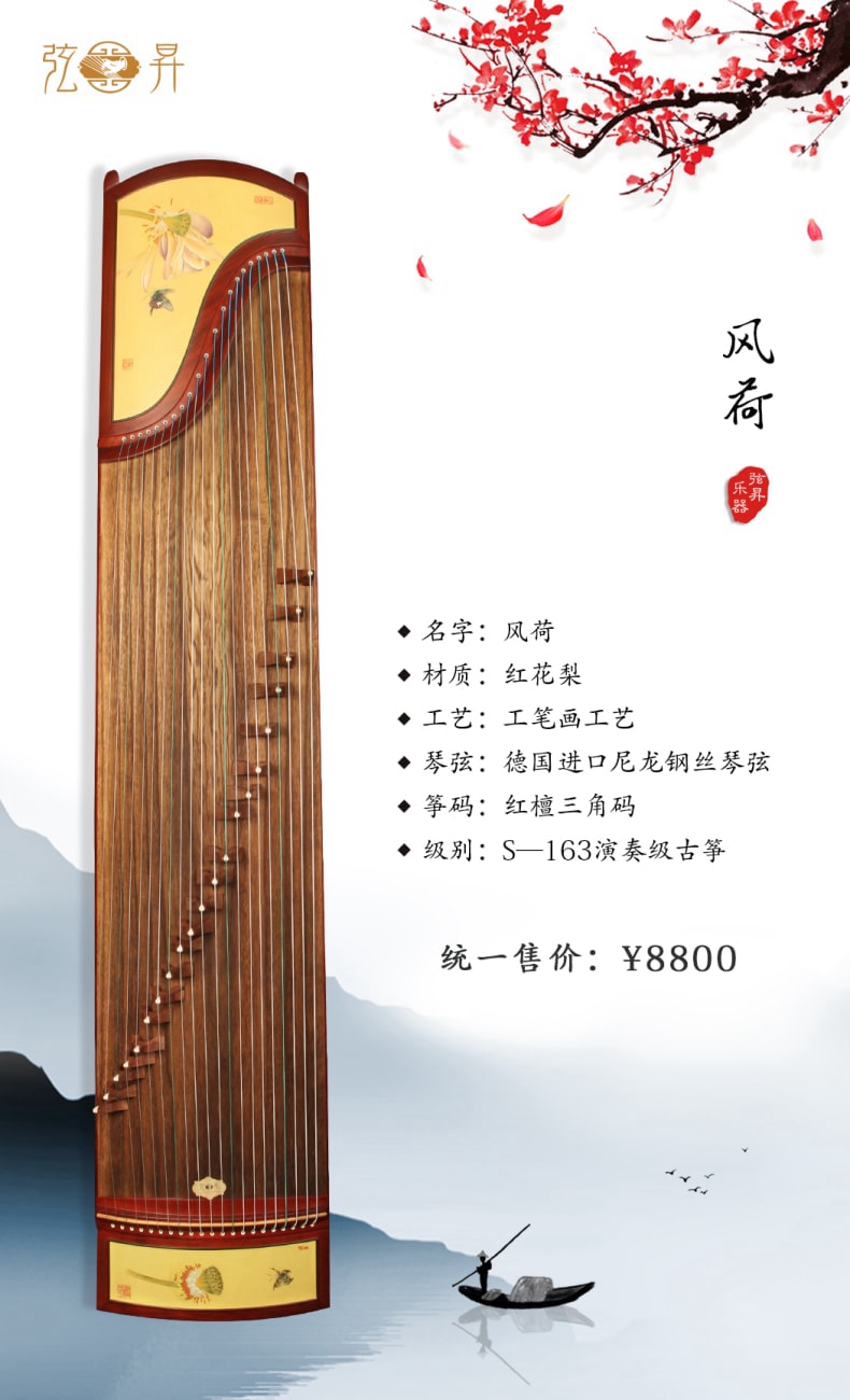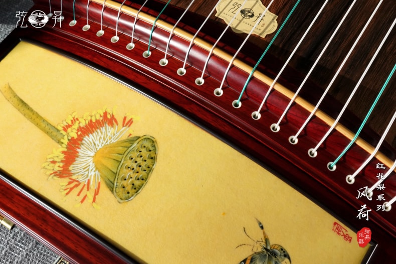 弦昇古筝-风荷是红花梨系列古筝;品名:风荷;材质:红花梨;工艺:工笔画;琴弦:德国进口尼龙钢丝弦;筝码:红檀三角码;级别:S-163演奏级古筝;