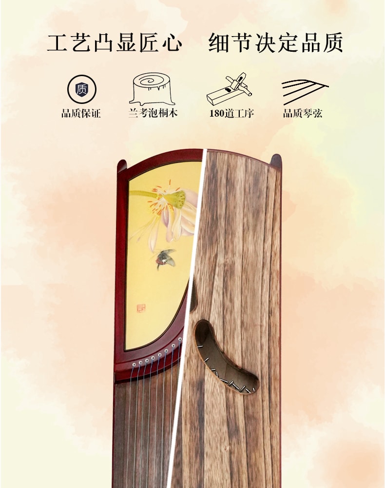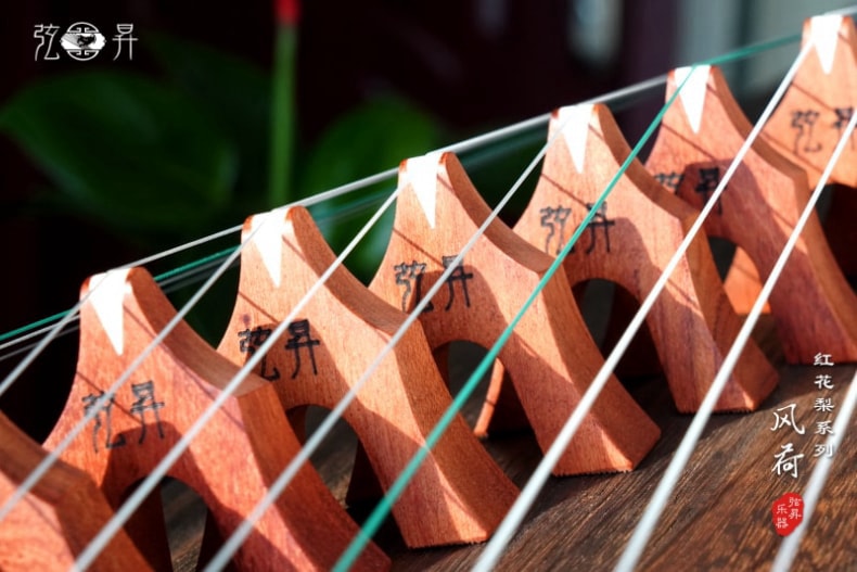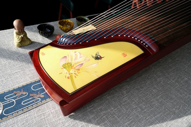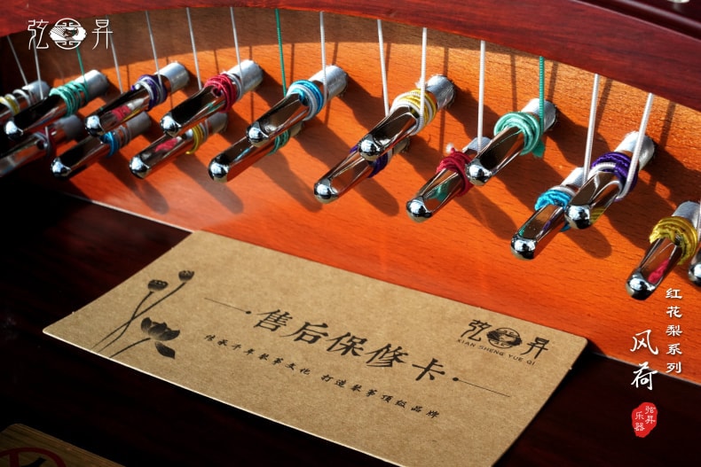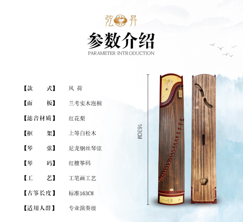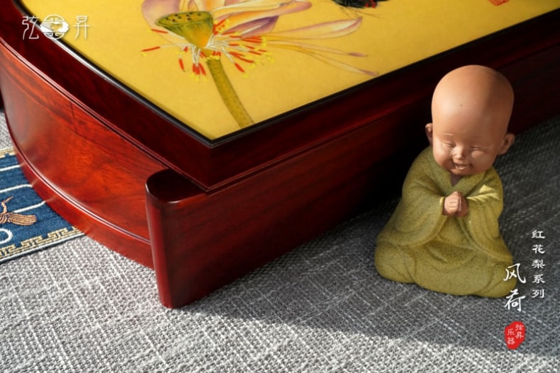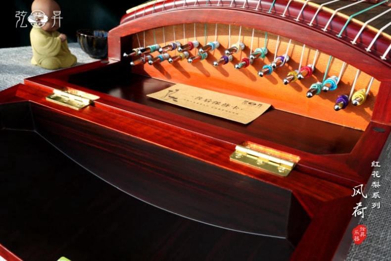 弦昇古筝-风荷是红花梨系列古筝;品名:风荷;材质:红花梨;工艺:工笔画;琴弦:德国进口尼龙钢丝弦;筝码:红檀三角码;级别:S-163演奏级古筝;