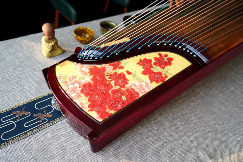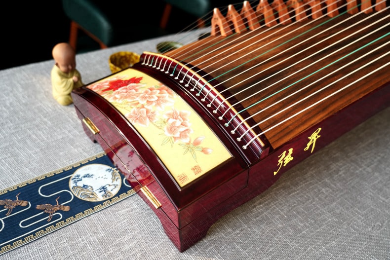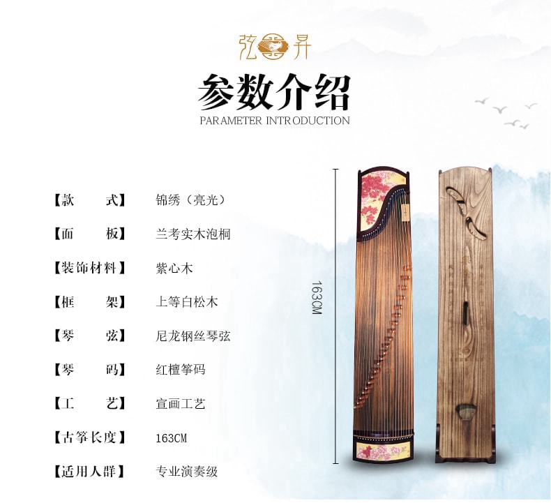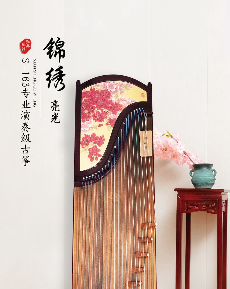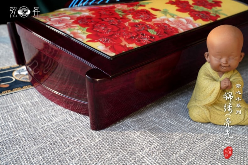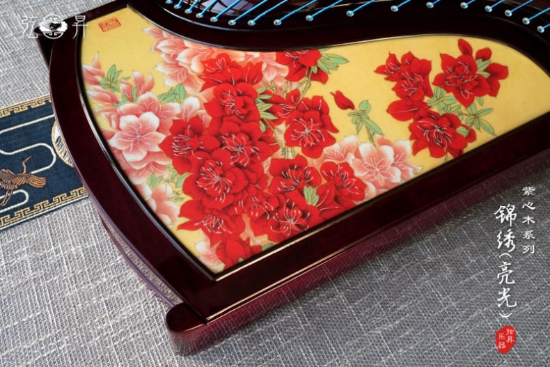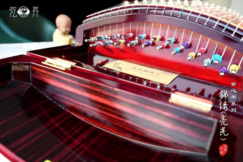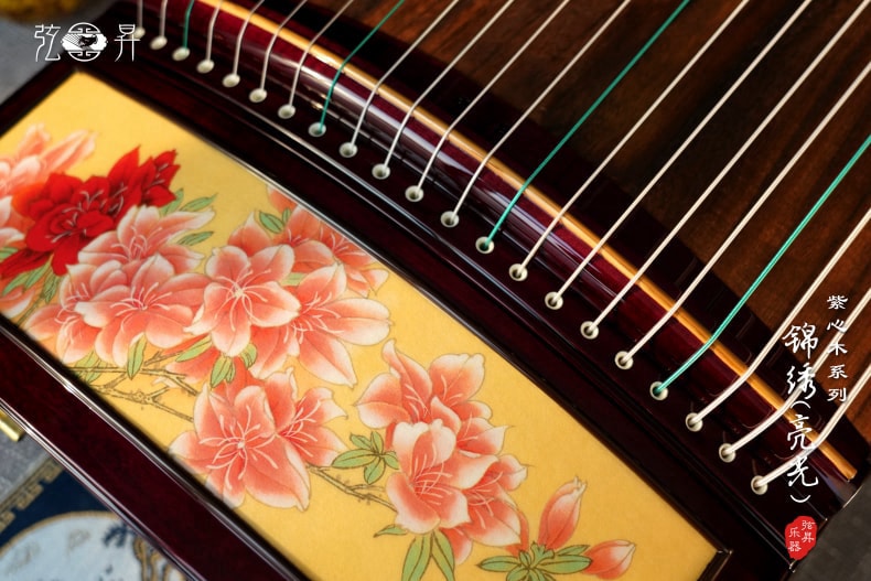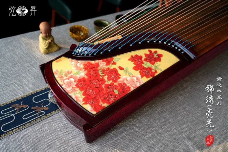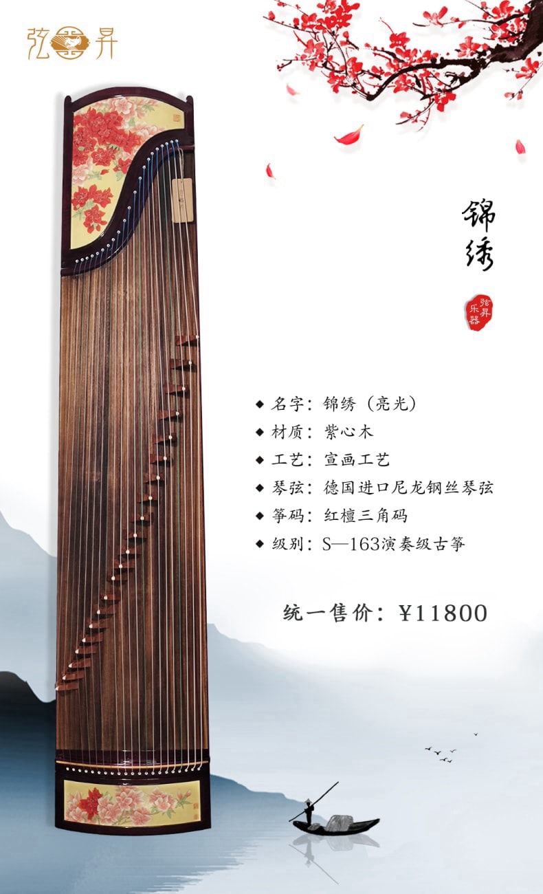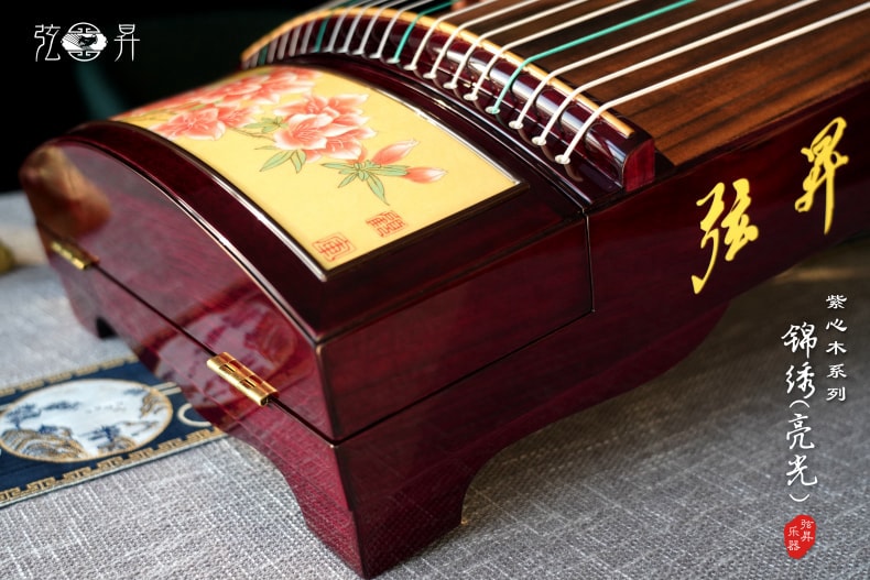 弦昇古筝-锦绣(亮光)是紫心木系列古筝,品名:锦绣(亮光);材质:紫心木;工艺:宣画;琴弦:德国进口尼龙钢丝弦;筝码:红檀三角码;级别:S-163演奏级古筝;