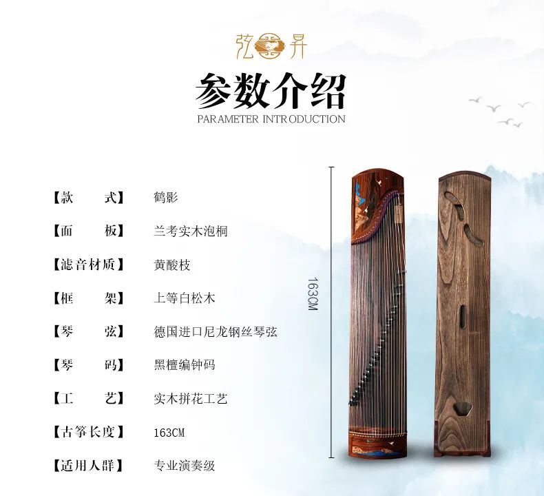 弦昇古筝-鹤影是黄酸枝系列新款古筝,品名:鹤影;材质:黄酸枝;工艺:实木拼花;琴弦:德国进口尼龙钢丝弦;筝码:黑檀编钟码;级别:S-163演奏级古筝
