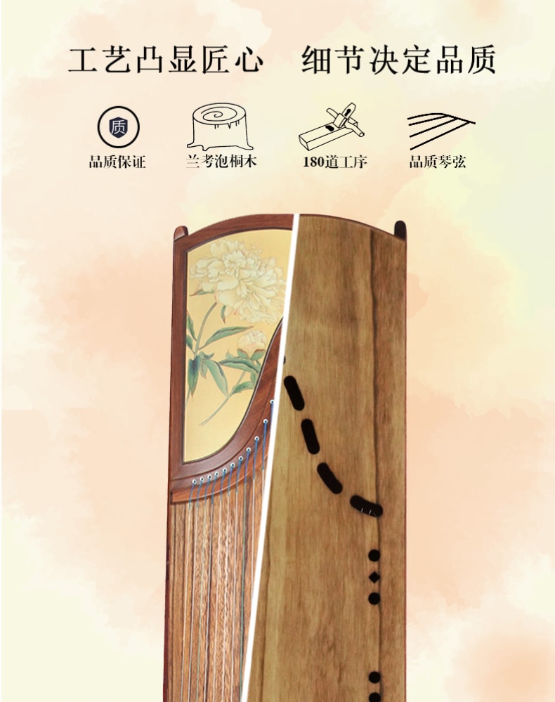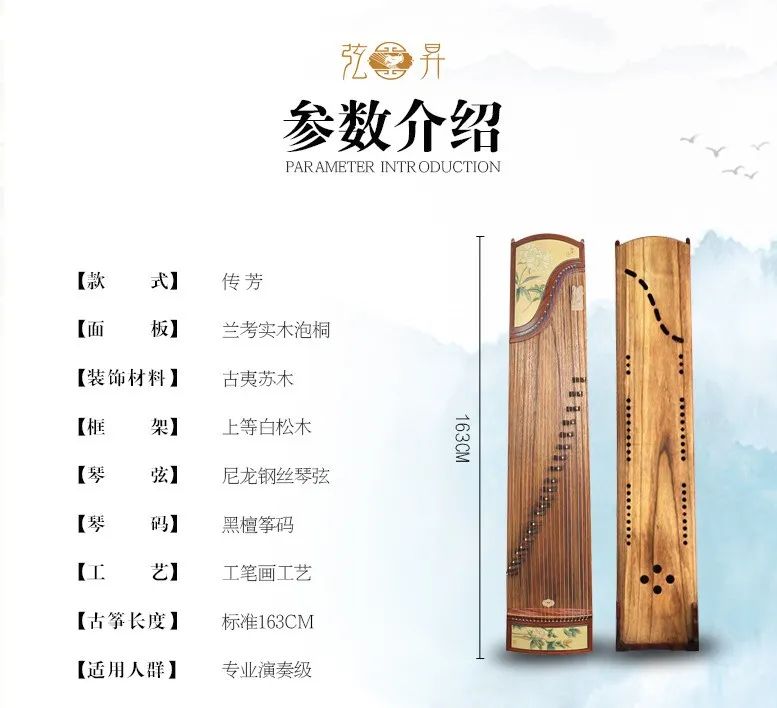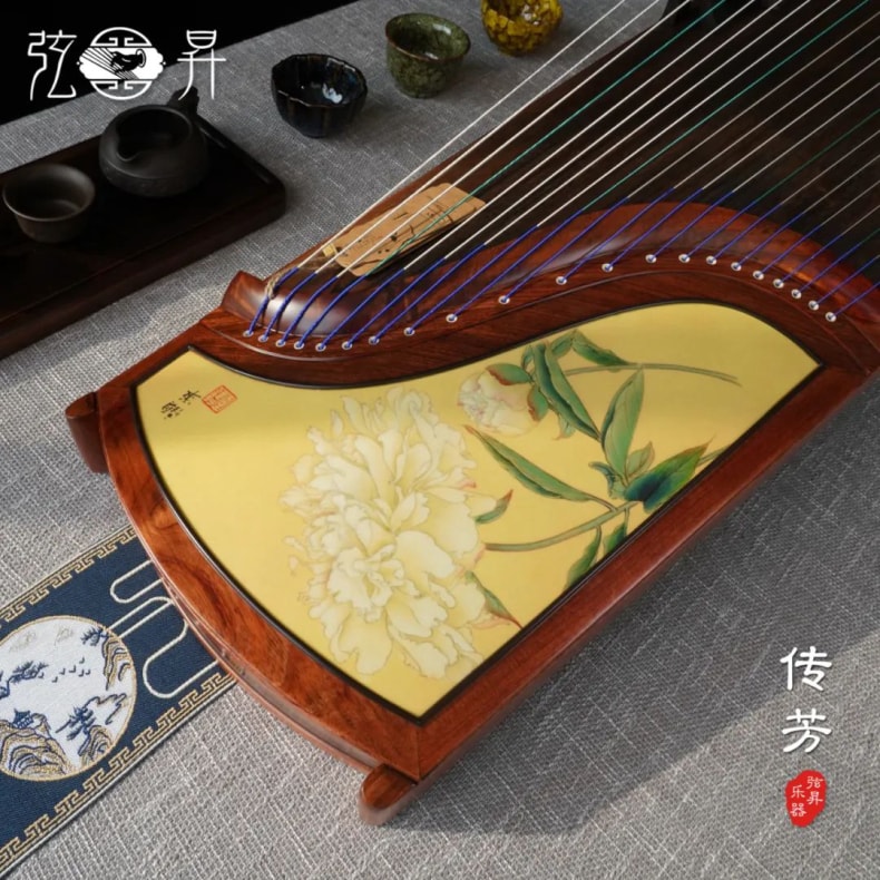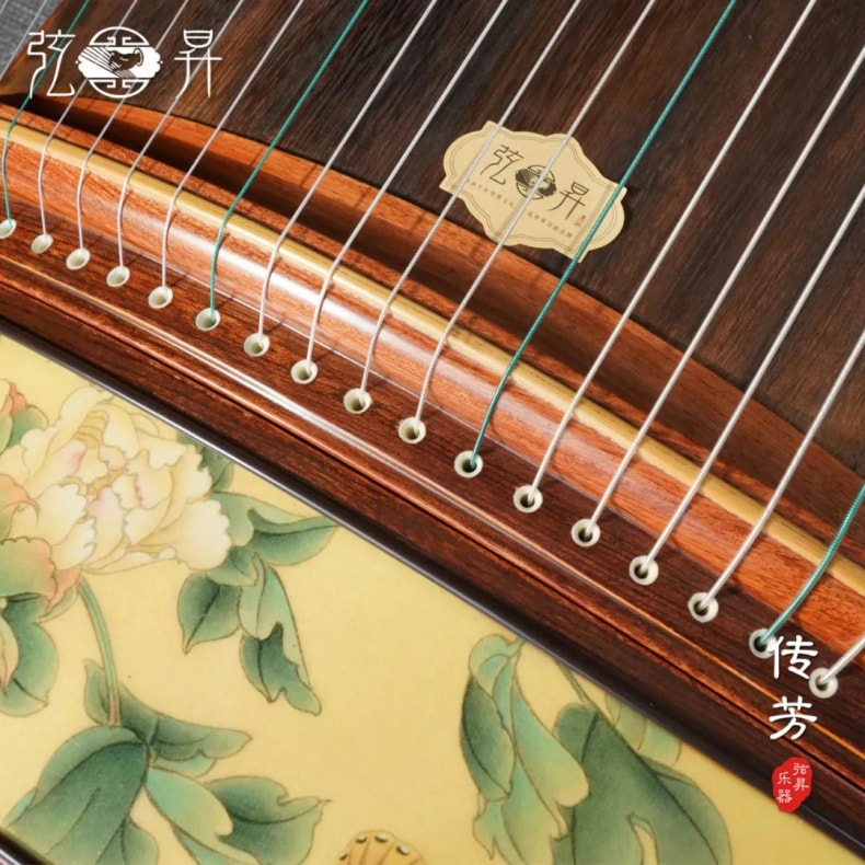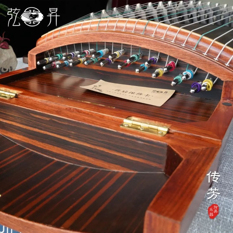 弦昇古筝-传芳是古夷苏木系列古筝;品名:传芳;材质:古夷苏木;工艺:中国工笔画;琴弦:德国进口尼龙钢丝弦;筝码:黑檀三角码;级别:S-163专 业演奏级古筝