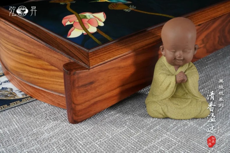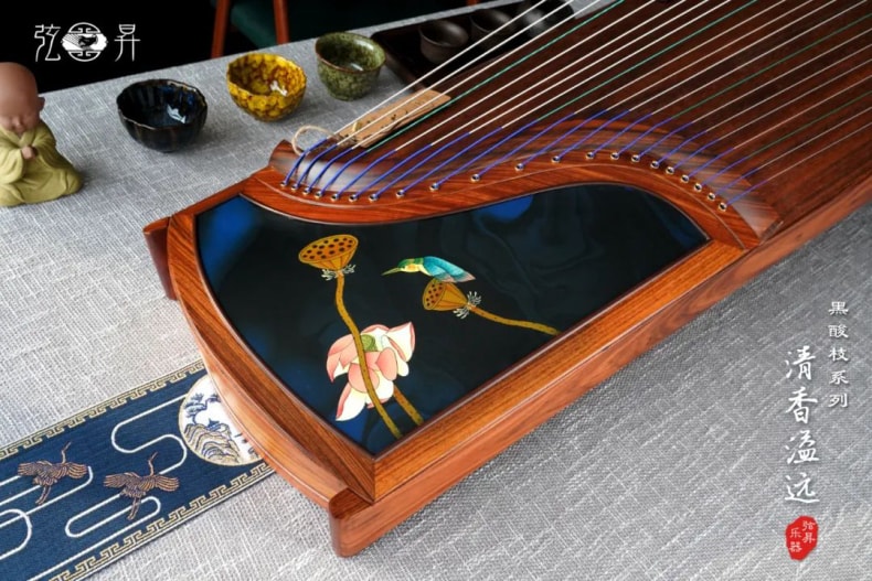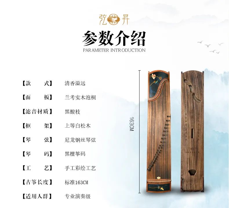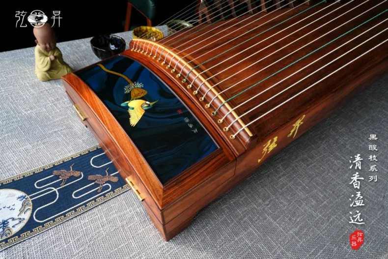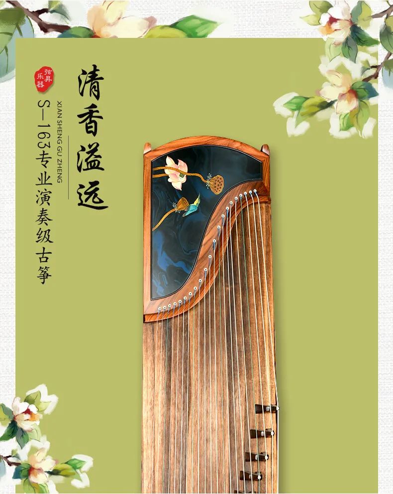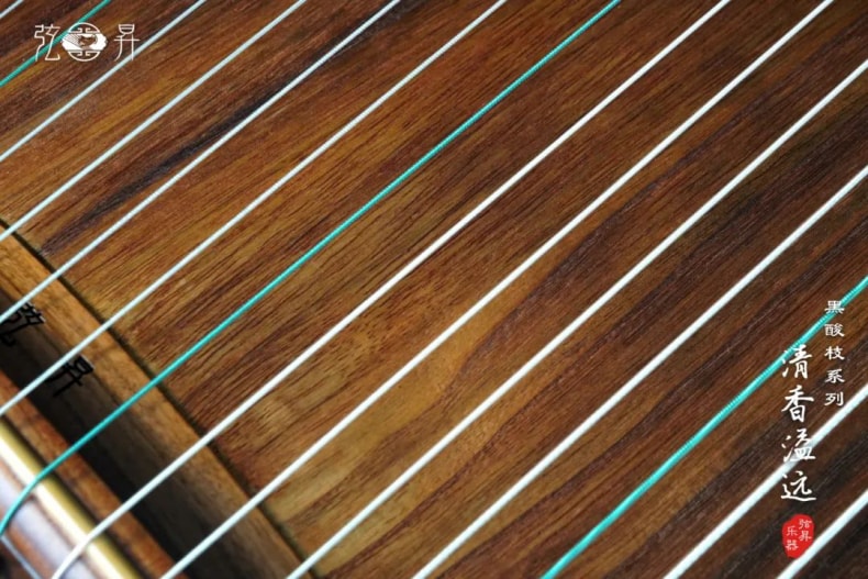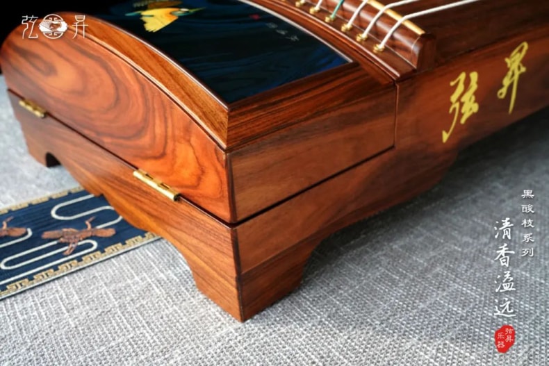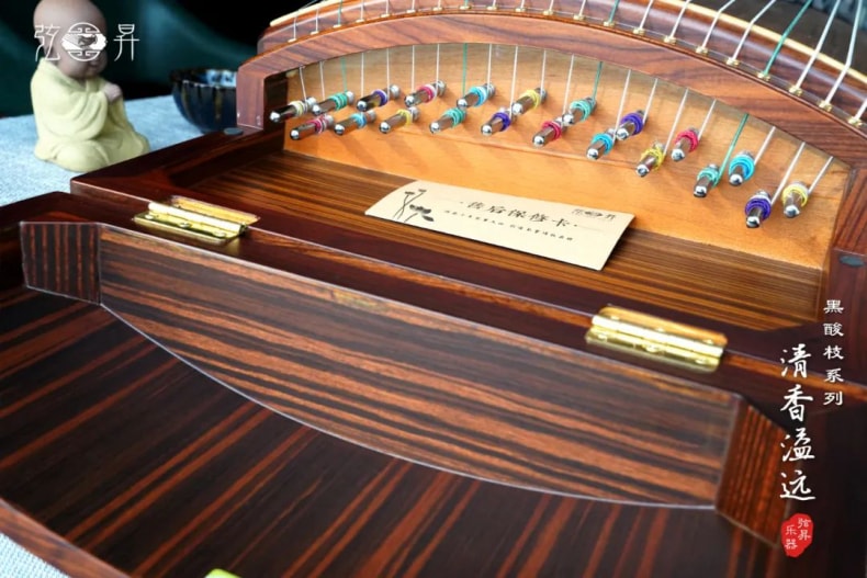 弦昇古筝-清香溢远是黑酸枝系列古筝。品名:清香溢远;材质:黑酸枝;工艺:手工彩绘;琴弦:德国进口尼龙钢丝弦;筝码:黑檀三角码;级别:S-163专 业演奏级古筝。