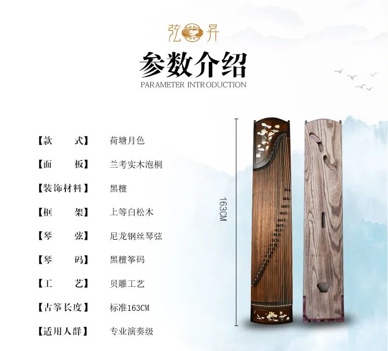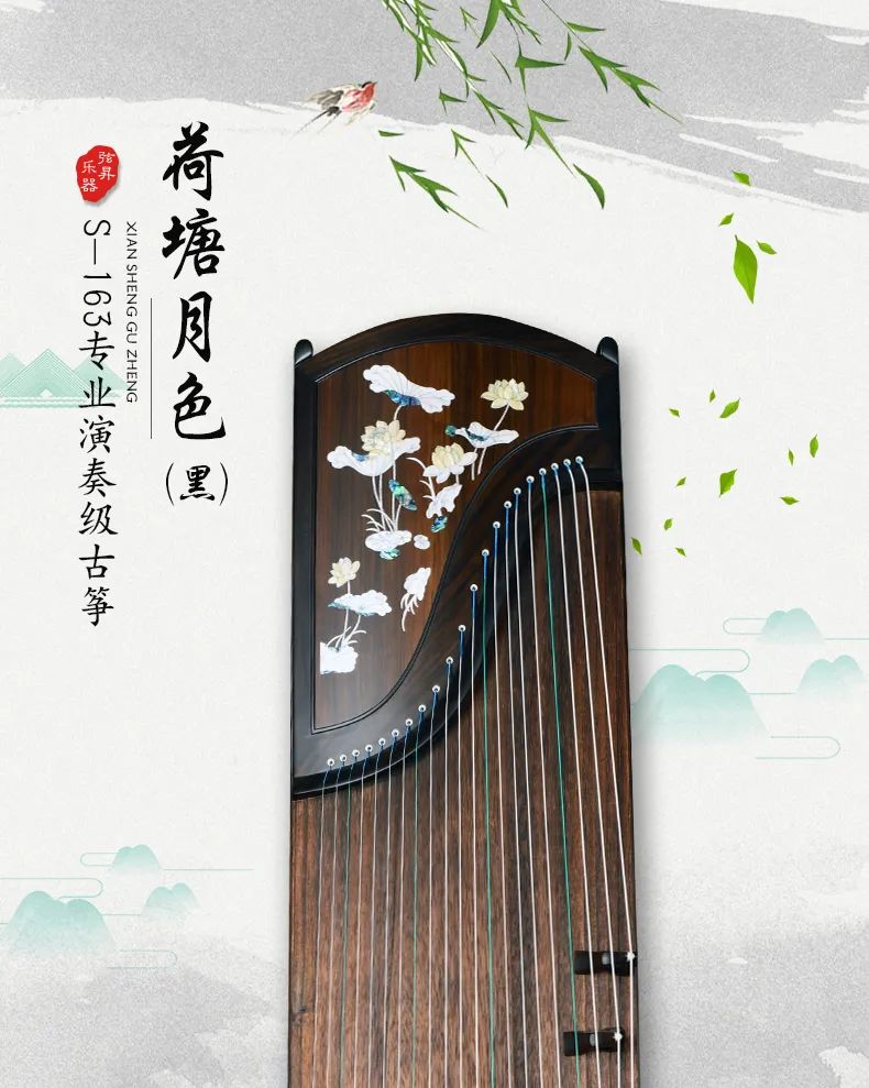 弦昇古筝-荷塘月色是黑檀系列古筝。品名:荷塘月色(黑);材质:黑檀;工艺:贝雕;琴弦:德国进口尼龙钢丝弦;筝码:黑檀三角码;级别:S-163专 业演奏级古筝